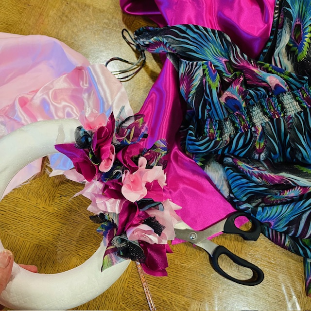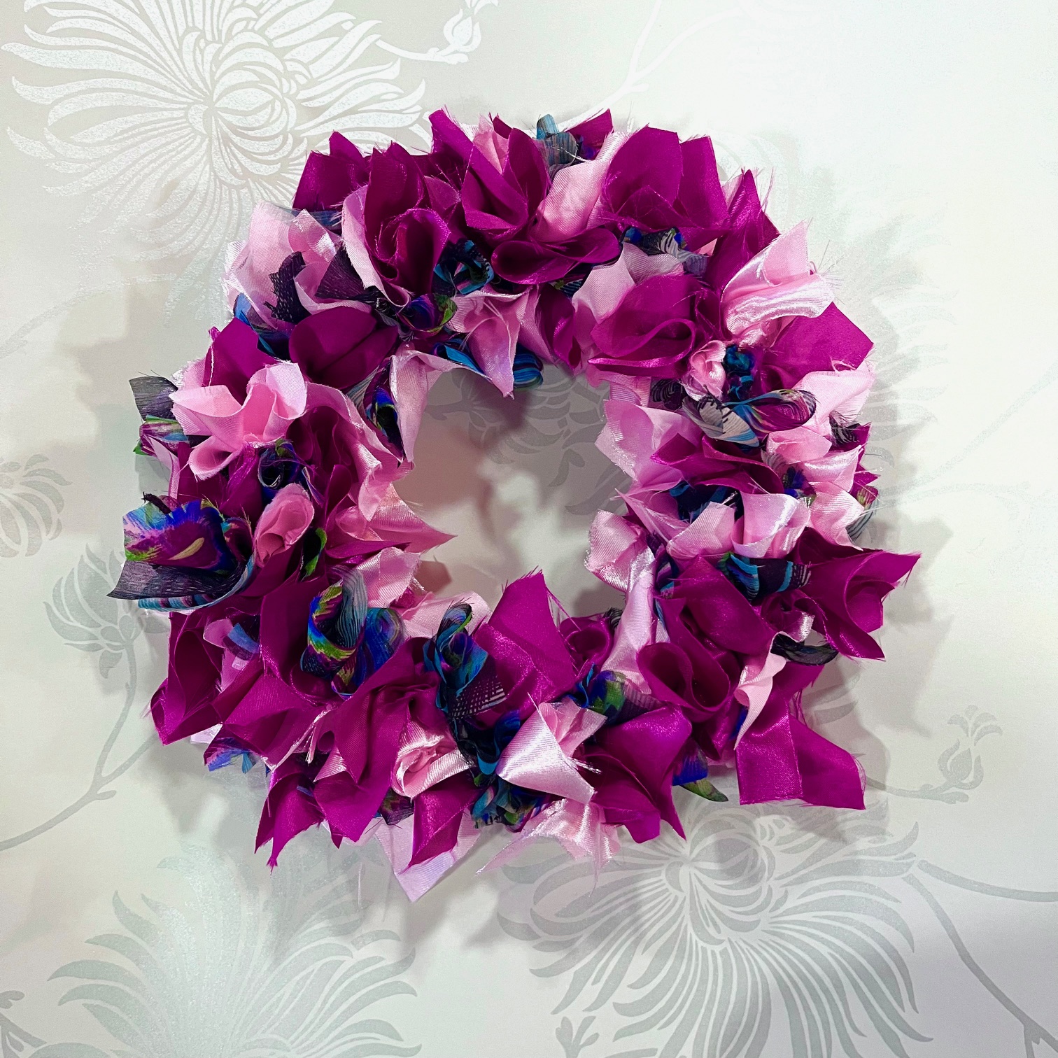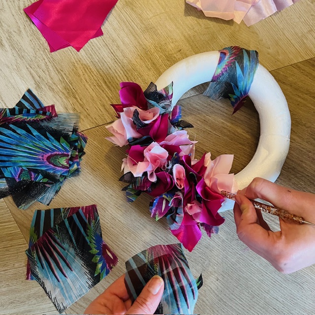 Cet atelier créatif recycle des vêtements et tissus pour créer une couronne aux couleurs de saison. Camaieu de roses pour une couronne printanière, ou orangée à l’arrivée de l’automne, la sélection de tissus/vêtements récupérés permet de composer des couronnes personnalisées grâce a de simples carrés découpés et piqués dans un support. La technique est très facile et accessible à tous. Résultat bluffant!