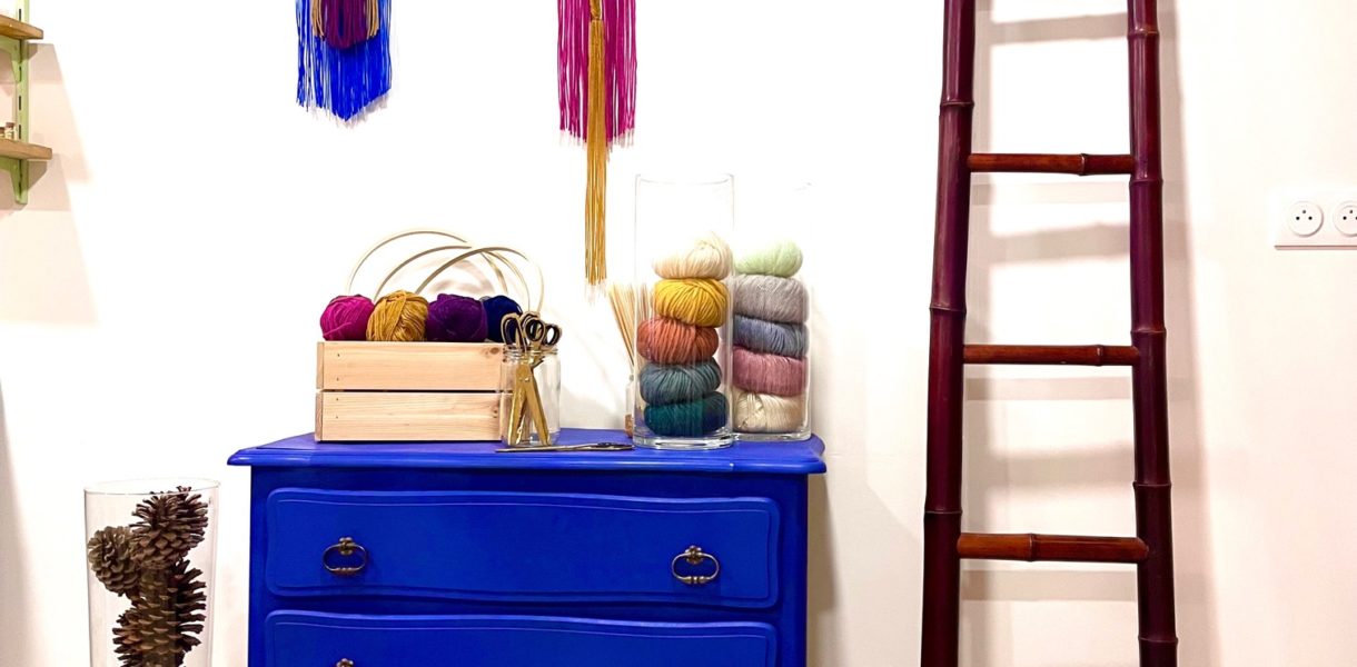 Possibilité d’acheter à l’atelier cercles et pelotes pour compléter votre décoration et ainsi constituer un duo ou trio de tentures à confectionner chez vous.